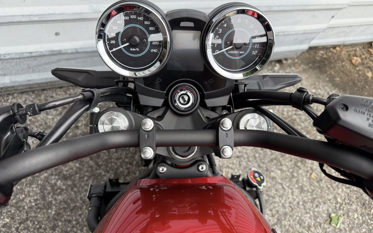 Dual ø300 mm front disc brakes and ø220 mm rear deliver plenty of braking power. The round discs contribute to the bike's retro sport image.